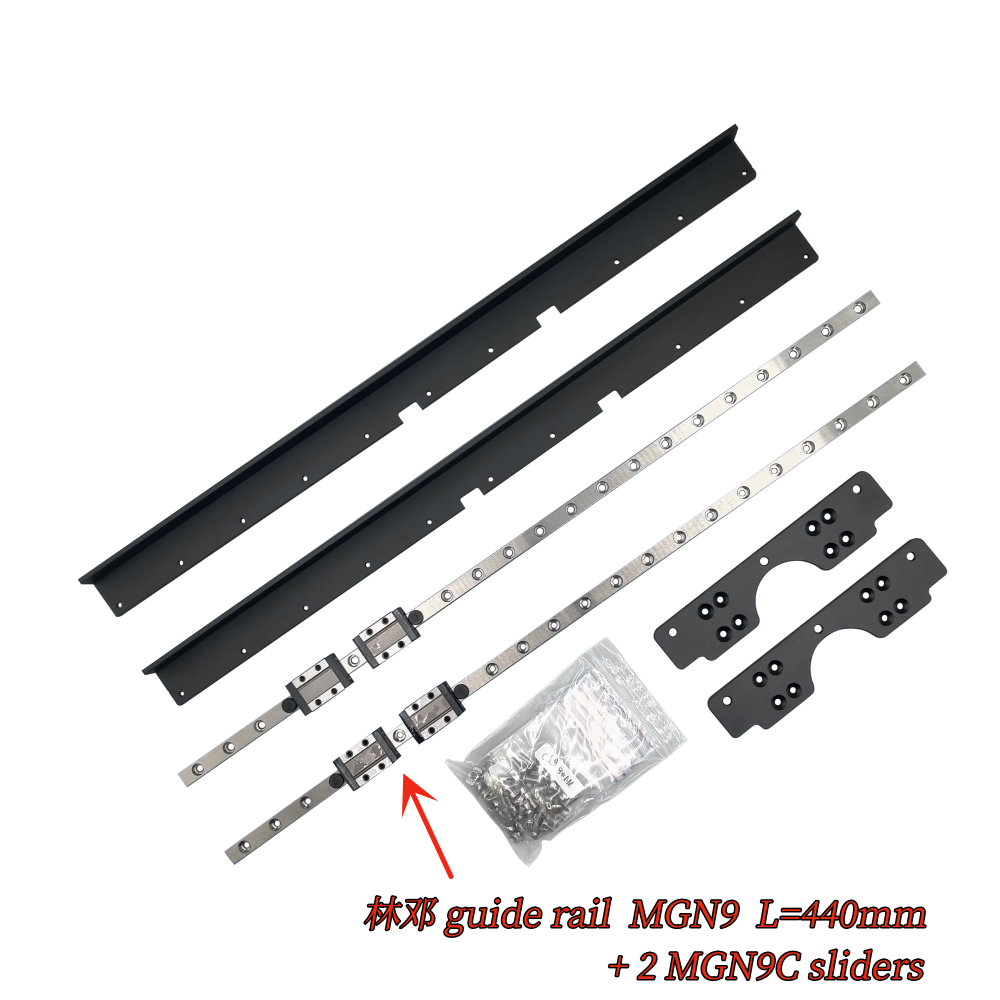 2. The linear guide rails and sliders are made of high-carbon chromium bearing steel and use electroplating rust prevention technology, with high hardness, wear resistance, smoothness, and good rust prevention ability.Y-axis slide rail specifications are MGN9C, L440mm, with a quantity of 2 pieces, and X-axis linear rail specifications are MGN9H, L400mm.